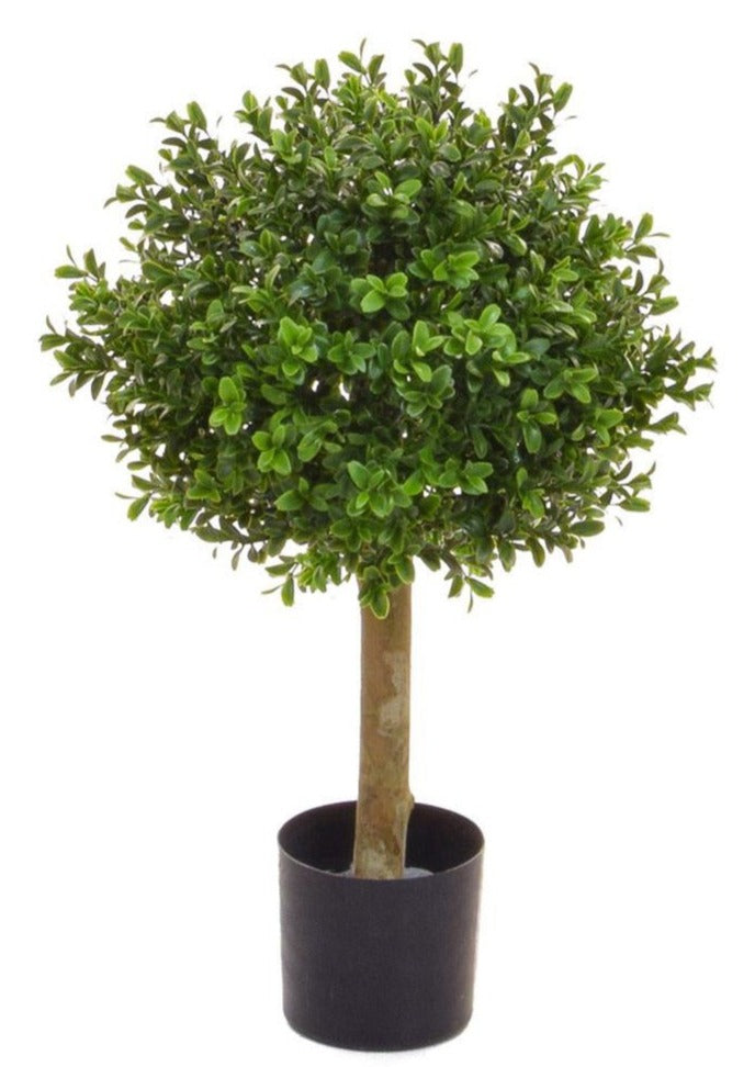 This artificial boxwood ball is made with an outdoor grade boxwood / buxus foliage with a 30cm diameter fixed onto a stem and set in a small black nursery pot ready to place in a pot of your choice, for all year round greenery.
